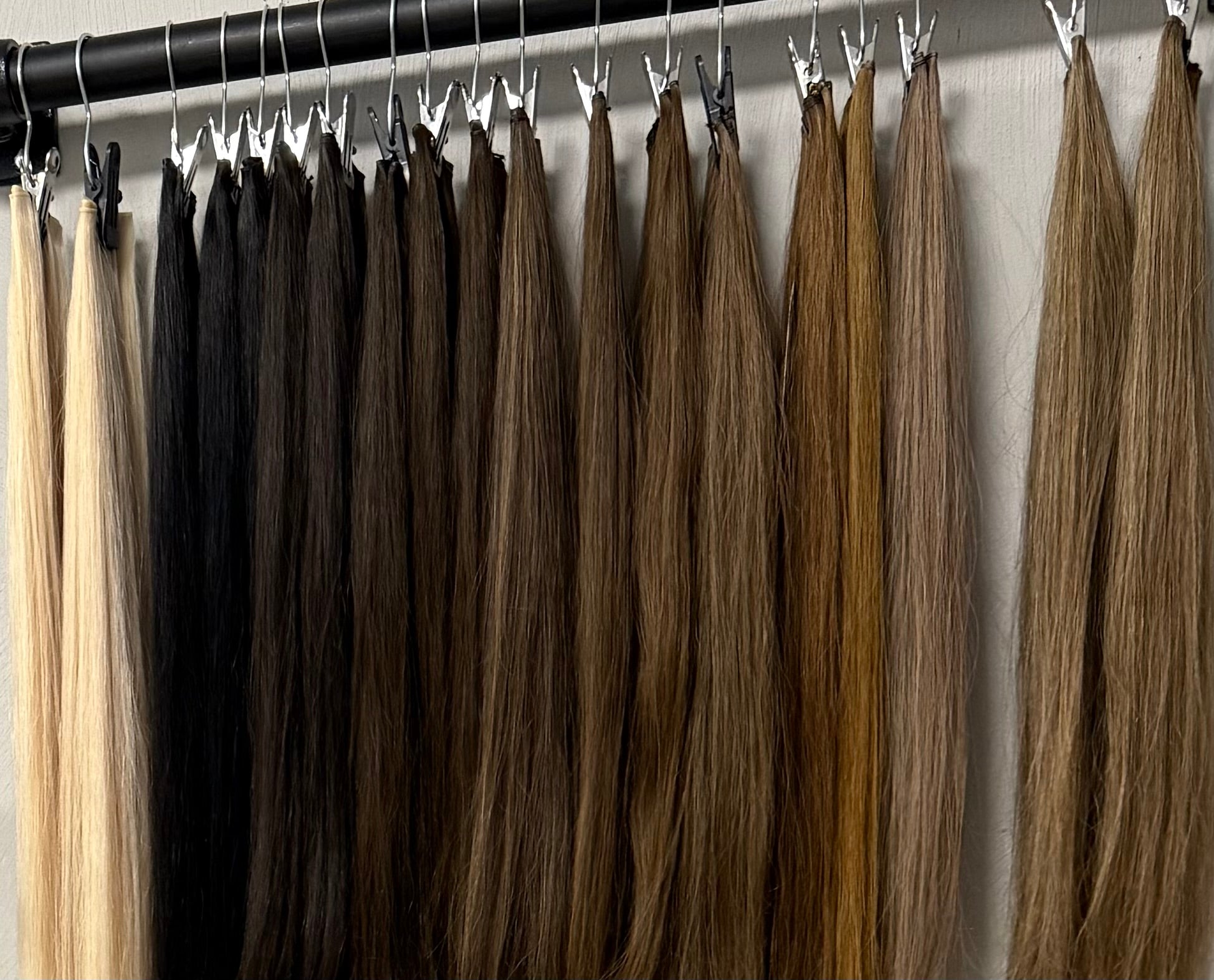 Wij plaatsen de wefts met microringen, naald en draad. Er wordt geen lijm of warmte gebruikt, waardoor jouw eigen haar gezond blijft en de weaves stevig op hun plek zitten.